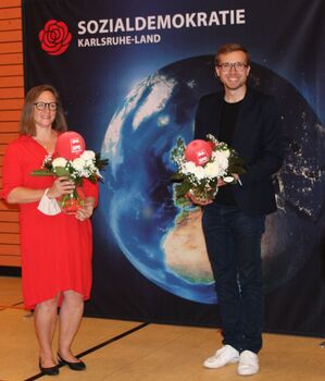 Bei der Neuwahl des Kreisvorstandes wurden Alexandra Nohl mit 88 Prozent und Christian Holzer mit 95 Prozent der Stimmen zur neuen Doppelspitze gewählt. Ein historischer Augenblick für die Sozialdemokratie im Landkreis Karlsruhe. "Wir wollen politischer Motor im Landkreis Karlsruhe werden und auch die Landes-SPD mit innovativen Ideen stärken. Wir wollen ein besseres Leben für alle!", gaben sich die neuen Kreisvorsitzenden Alexandra Nohl und Christian Holzer kämpferisch. Zu ihren Stellvertretern wurden gewählt Dennis Eidner (Bad Schönborn), Aisha Fahir (Pfinztal), Saskia Heiler (Waghäusel) und Volker Geisel (Zaisenhausen). Raphael Posselt wurde als Kreiskassier bestätigt. Weiter wurden gewählt: Projektbeauftragte Sebastian Emmert (Waghäusel) und Farias Abbas (Stutensee), Beauftragte Kommunikation Ute De Clemente (Graben-Neudorf) und Viktor Ebinger (Östringen), Beauftragte Verwaltung Britta Brandstäter (Bruchsal) und Karina Merten (Untergrombach), Mitgliederbeauftragte Brigitte Schneider (OV Weingarten). Als Beisitzer wurden gewählt: Patrick Diebold (OV Ettlingen), Özgur Sahin (Helmsheim), Helen Hanke (Bad Schönborn), Renate Knauss (Bretten), David Heger (Waghäusel), Anneke Graner (Ettlingen), Stephan Walter (Gondelsheim) und Fabienne Stauder (Stutensee). Im weiteren Verlauf der Sitzung wurden die Antrags-, Schieds- und Mandatsprüfungskommission sowie die Delegierten für den Landesparteitag und die Landesdelegiertenkonferenz gewählt.